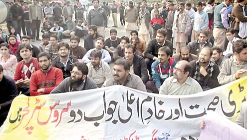 ینگ ڈاکٹرز کے رہنمائوں نے اپنے خطابات میں حکومت کو سروس سٹرکچر پر عملدرآمد کر نے کا مطالبہ کیا جبکہ اس مو قع پر احتجاجی ریلی بھی نکالی گئی اور علامہ اقبال میڈیکل کالج کی طر ف سے روڈ کو بلاک کر دیا گیا۔ ینگ ڈاکٹرز کا کہناتھاکہ احتجاج کادائر ہ کار پورے صوبے میں پھیلاد یاجائے گا کیونکہ حکومت نے سروس سٹر کچر کے معاملہ پر وعدہ خلافی کی ہے۔ دریں اثنا سانحہ پشاور کے باعث ینگ ڈاکٹرزایسوسی ایشن نے آ ج سروسز ہسپتال میں ہونے والا احتجاج منسوخ کر دیا ہے۔