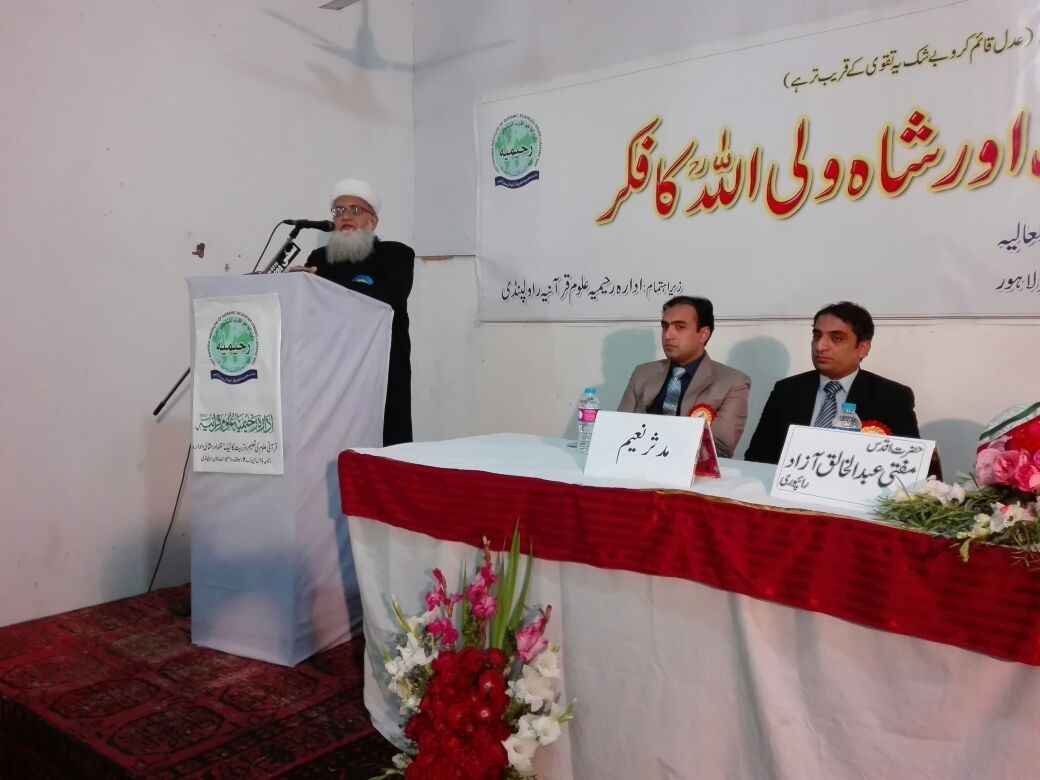 ان خیالات کا اظہار انہوں نے ادارہ رحیمہ قرآنیہ راولپنڈی کے زیر اپتمام بدلتے عالمی حالات اور شاہ ولی اللہ کے فکر پر منعقدہ سیمینار سے خطاب کرتے ہوئے کیا ، اداے کے زونل منتظم مدثر نعیم اعوان، مفتی محمد مختار حسن ، عرفان احمد اور مقصود احمد بھیتقریب میں شریک تھے۔
